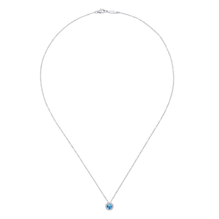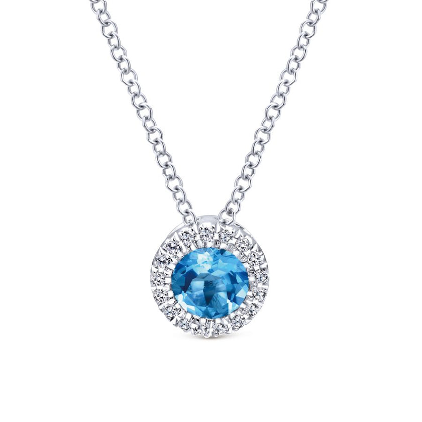 14K White Gold Round Swiss Blue Topaz and Diamond Halo Necklace, 0.06ctw, H/I-SI, 0.55ct Bl Topaz, 18"