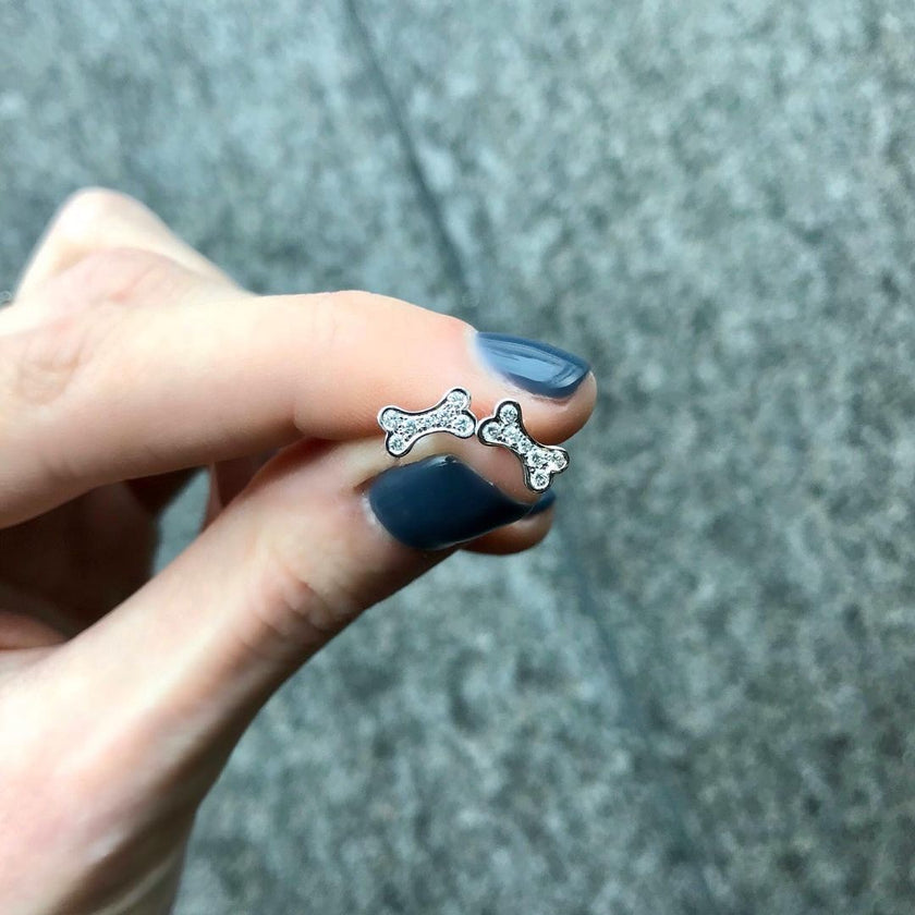 18KT white gold dog bone earrings with 0.15ctw round diamond...