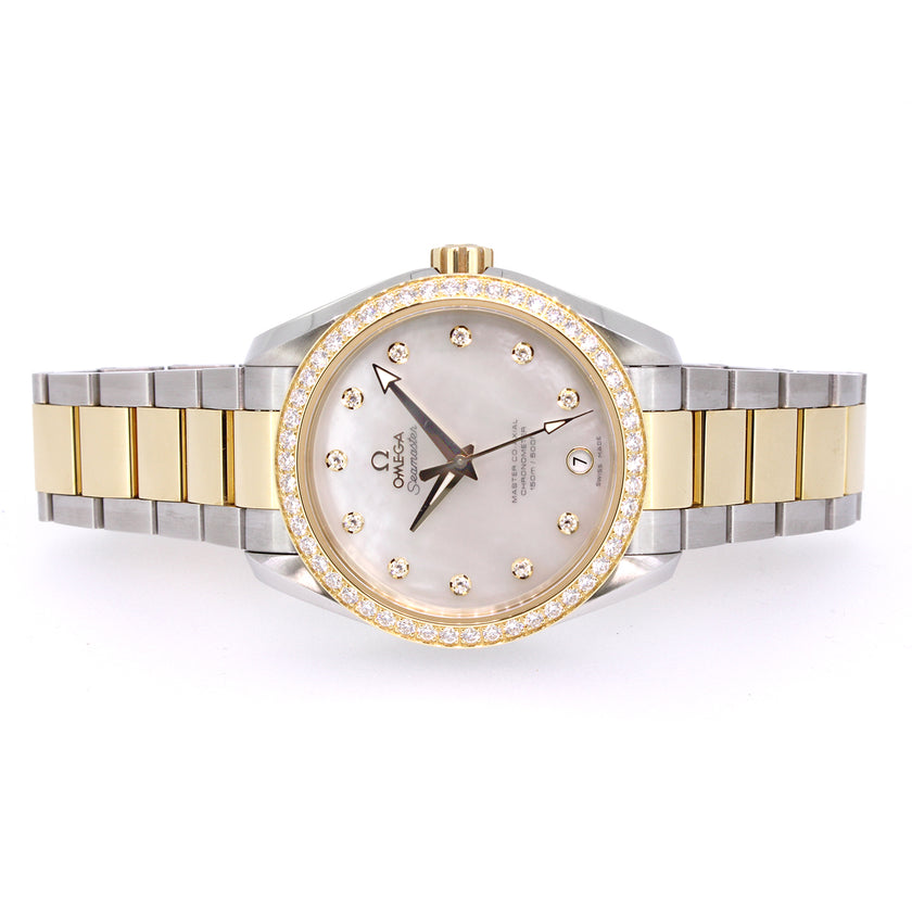 Unworn stainless steel and 18KT yellow gold Omega Seamaster Aqua Terra with diamond bezel and diamond mother of pearl dial, 39mm. Box and papers included. Ref 231.25.39.21.55.002